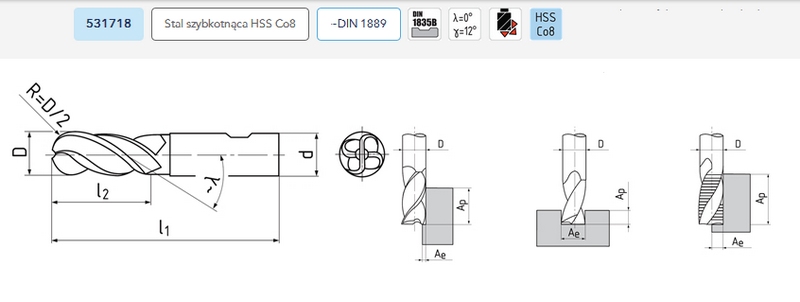 Frez kopiujący długi R8 Ø16x63x123, Z4, DIN ≈1889, HSSCo8