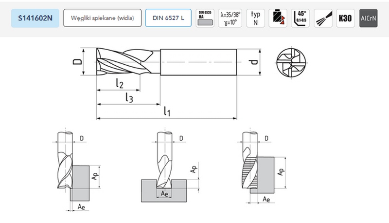 Frez węglikowy Ø 14x26x83, Z4, λ 35°-38°, DIN 6527L, SC, AlCrN, N