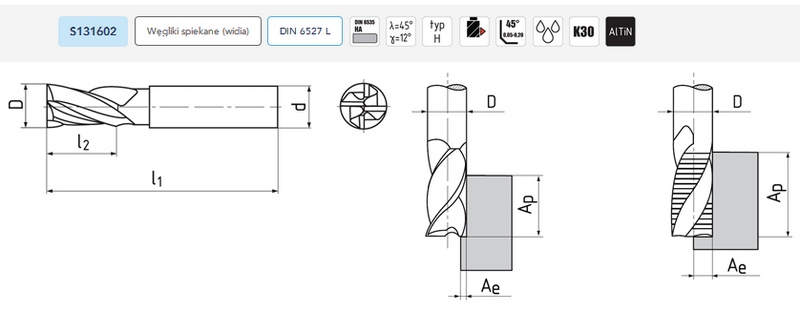 Frez węglikowy Ø 8x19x63, Z6, λ 45°, DIN 6527L, SC, AlTiN, H