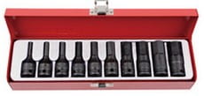 W zestawie nasadki 3/8" z końcówką Hex w rozmiarach: 4,5,6,7,8,10,12,14,16,17 mm