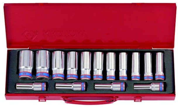 Zestaw długich nasadek 1/2" King Tony. W zestawie znajdują się nasadki długie, 12-kątne w rozmiarach: 10, 11, 12, 13, 14, 15, 16, 17, 19, 21, 22, 24, 27, 30, 32. Zestaw w metalowej walizeczce.