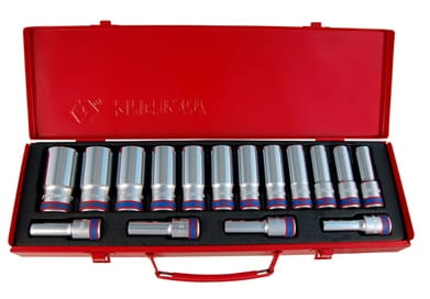 Zestaw długich nasadek 1/2" King Tony. W zestawie znajdują się nasadki długie, 12-kątne w rozmiarach: 10, 11, 12, 13, 14, 15, 16, 17, 18,19, 21, 22, 24, 27, 30, 32. Zestaw w metalowej walizeczce.