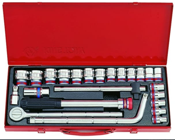 Komplet narzędzi 1/2" 24 częsci. W zestawie nasadki 6-kątne krótkie w rozmiarach calowych 3/8", 7/16", 15/32", 1/2", 9/16", 19/32", 5/8", 11/16", 3/4", 25/32", 13/16", 7/8", 15/16", 1", 1-1/16", 1-1/8", 1-3/16", 1-1/4" , nasadka 6-kątna do świec 21mm, grzechotka z rączką umożliwiającą użycie przedłużki wraz z przystosowaną do tego przedłużką z gumową rączką, przedłużka uchylna, pokrętło przesuwne oraz pokrętło typu L z uchwytem do przedłużki.