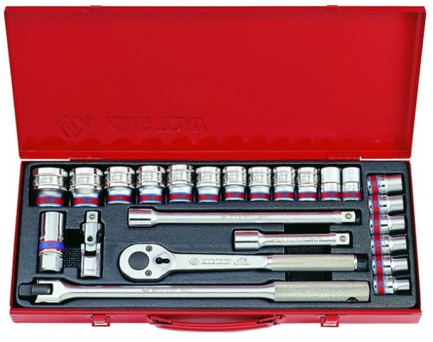 Komplet narzędzi 1/2" King Tony w metalowej kasecie. W zestawie znajdują się calowe nasadki, krótkie, 6-kątne[mm]: 5/16", 3/8", 7/16", 15/32", 1/2", 9/16", 19/32", 5/8", 11/16", 3/4", 25/32", 13/16", 7/8", 15/16", 1", 1-1/16", 1-3/16", 1-1/4", nasadka do świec 6-kątna, 21mm, grzechotka z moletowanym uchwytem, pokrętło łamane, dwie chromowane przedłużki oraz przegub Kardana