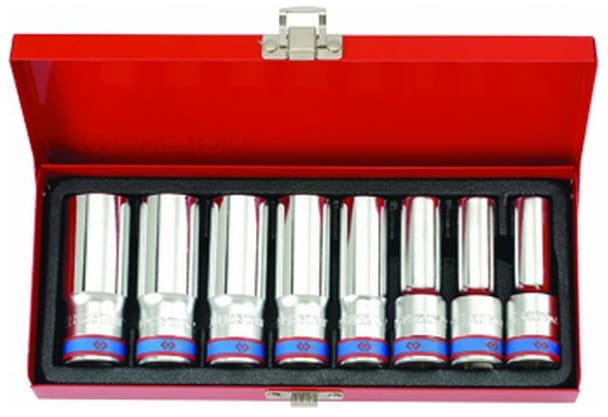 Zestaw długich nasadek 6-kątnych 1/2" firmy King Tony. Komplet narzędzi w metalowym pudełku. W zestawie znajdują się nasadki w rozmiarach 12, 13, 14, 17, 19, 21, 22, 23.