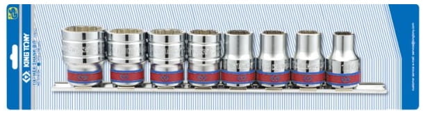 Komplet nasadek 1/2" King Tony na metalowej szynie. W zestawie 8 nasadek 12-kątnych krótkich w rozmiarach calowych: 3/8", 7/16", 1/2", 9/16", 1/16", 3/4", 13/16", 7/8". Do zestawu dołączana jest szyna na nasadki długości 230mm