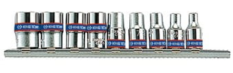 Komplet 9 nasadek 1/4" na szynie, łatwej do zamontowania na ścianie warsztatu. W zestawie nasadki w rozmiarach 4, 5, 6, 7, 8, 9, 10, 11, 13.