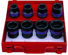 Komplet nasadek udarowych, 6-kątnych 3/4" firmy King Tony. Zestaw w metalowej kasecie zawiera 8 standardowych nasadek w rozmiarach 19, 22, 24, 27, 30, 32, 36, 38.