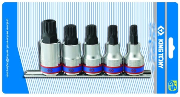 Komplet nasadek 1/2" z końcówką spline firmy King Tony. W zestawie 5 nasadek w rozmiarach M8, M10, M12, M14, M16. Nasadki wykonane z wysokiej jakości materiałów. Zestaw na szynie, ułatwiającej montaż na ścianie.