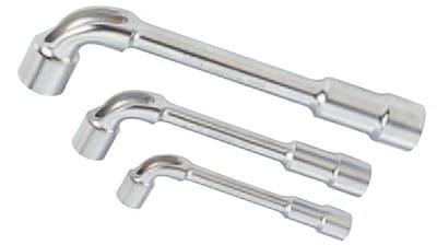 Klucz fajkowy 90 stopni. Krótsze ramię klucza posiada końcówkę 12-kątną, a dłuższe 6-kątną.