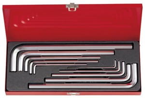 Zestaw ekstra długich kluczy imbusowych King Tony w metalowej kasecie. W zestawie znajduje się 10 kluczy o rozmiarach [mm]: 3, 4, 5, 6, 7, 8, 10, 12, 14, 17. Kaseta.
