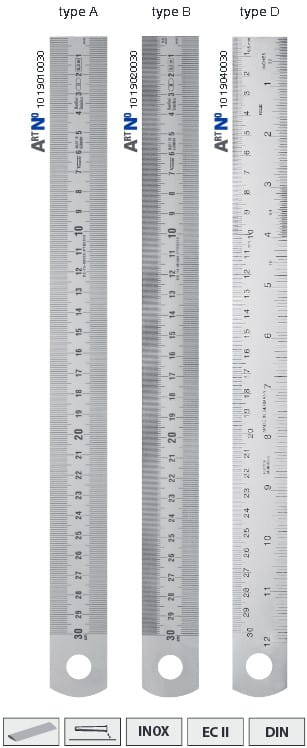 Typ D górna krawędź podziałka 1/2mm i 1 mm, dolna krawędź podziałka 1/64", 1/32" i 1/16"