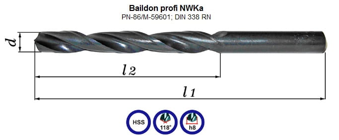 Wiertło kręte z chwytem cylindrycznym do stali i żeliwa ogólnego stosowania Baildon profi NWKa PN-86/M-59601; DIN 338 RN