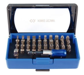 Zestaw bitów 32 częściowy w plastikowym etui. W skład zestawu wchodzą bity bity krótkie (25mm) w następujących rozmiarach: płaski 3.0, 4.0, 5.0, 6.0, krzyżak PH1, PH2x2, PH3, pozidriv PZ1, PZ2x2, PZ3, torx T10, T15, T20, T25, T27, T30, T40, hex H3,H4,H5,H6 oraz Torx z otworem T10,T15,T20,T25,T27,T30,T40. Do zestawu jest dołączane są dwa uchwyty.