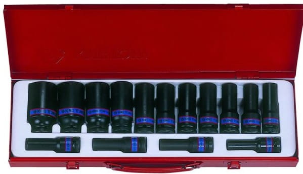 Komplet długich nasadek udarowych 1/2" firmy King Tony. W zestawie znajduje się 15 nasadek: 10, 11, 12, 13, 14, 15, 16, 17, 19, 21, 22, 24, 27, 30, 32. Zestaw w metalowej kasecie