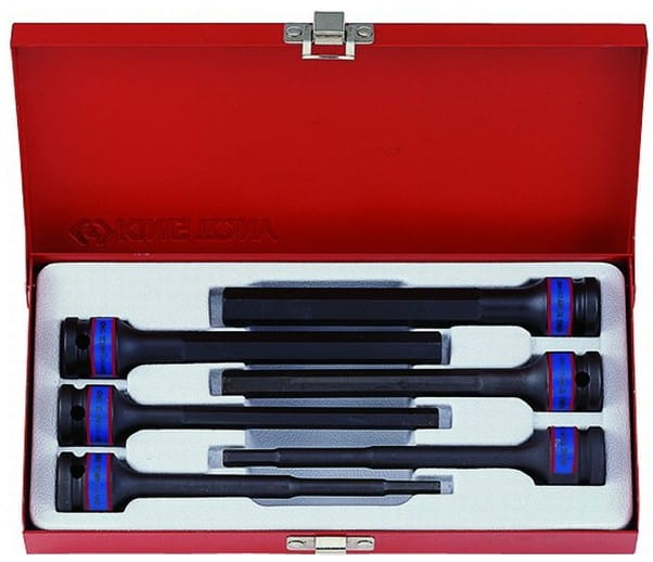 Komplet extra długich nasadek udarowych 1/2" z końcówką hex. W zestawie znajdują się nasadki 6 kątne w rozmiarach 5, 6, 8, 10, 12, 14. Nasadki mają 150mm długości. Zestaw w metalowej kasecie.